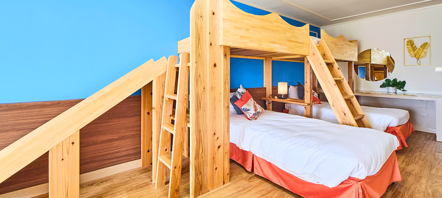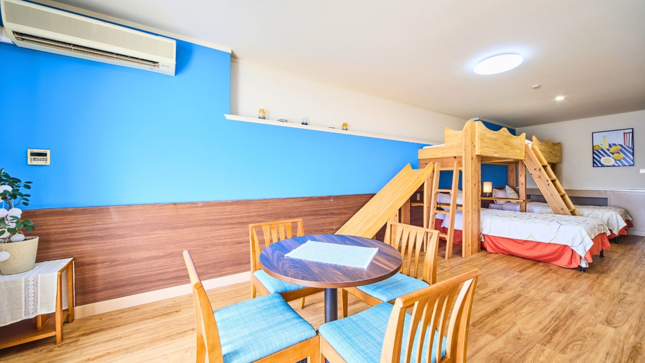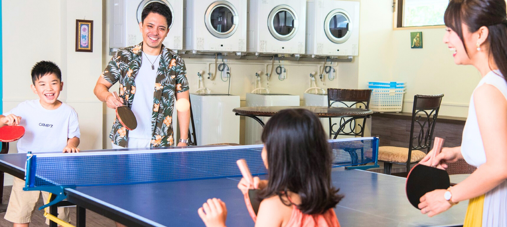 雨の日も夜のひとときも、天気や時間を気にせず過ごせる館内施設が充実しています。「アソビバ‼」のフリースペースや県内最大級のキッズコーナー、卓球コーナー、無料ランドリーまで、遊びも暮らしも家族みんなにうれしい設備がそろった、安心してご滞在いただける遊び心いっぱいのファミリーリゾートです。